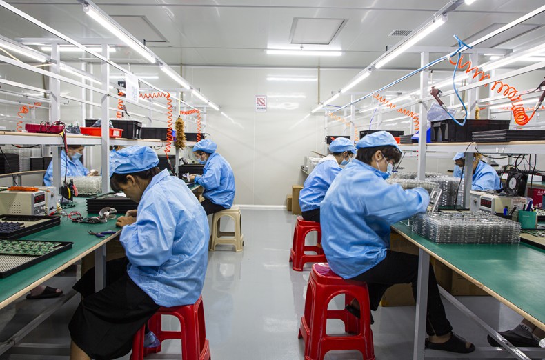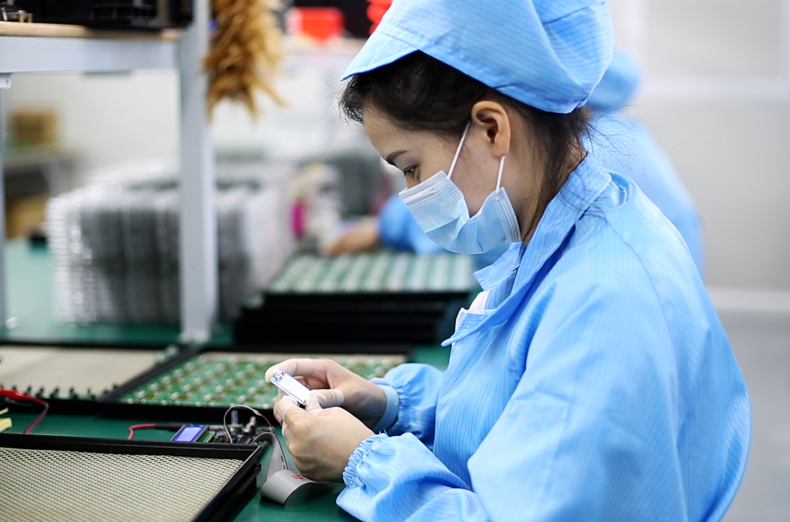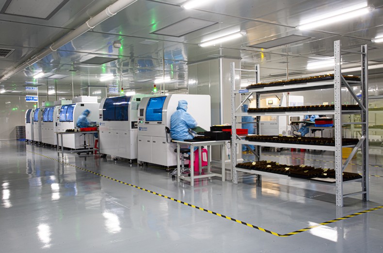 繪晶科技在液晶屏生產(chǎn)現(xiàn)場很重視靜電防護,空調(diào)無塵生產(chǎn)車間,員工一律穿防靜電服,防靜電鞋,進入現(xiàn)場前要先放靜電。以免人體自帶靜電或者移動過程中產(chǎn)生靜電。作業(yè)員應(yīng)嚴格按照規(guī)程作業(yè),嚴禁人體任何部位直接接觸屏、模組中的接口、引腳等金屬導電部分。此外,保持生產(chǎn)場地空間有合理的溫度和濕度,溫度控制在28度左右,濕度在60%左右。這樣整個空間就形成了以空氣為導電體的放電體。這樣在這個空間里各種摩擦運動產(chǎn)生的靜電就會得到及時有效的釋放。